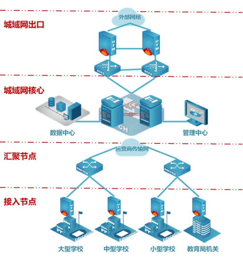 教育城域网是我国教育信息化以及基础教育信息化公共服务体系开展规划中最为关键的一环。教育城域网是以计算机网络技术为基础、以网络教育资源与教育软件为核心、以实现信息化教育和集中式管理为目的、以提高教学与管理效益为根本、为学校教育信息化给予全方位服务、指导的教育网络。教育城域网将学校等教育组织全部联接到网络中,最终形成一个区域性的互联、信息交换、资源共享和远程教育的基础构架;使各学校的网络不再孤立存在,而是完全融入到城域信息网络体系中,成为建设基础教育信息化公共服务体系的基础,为教育开展给予信息化支撑。