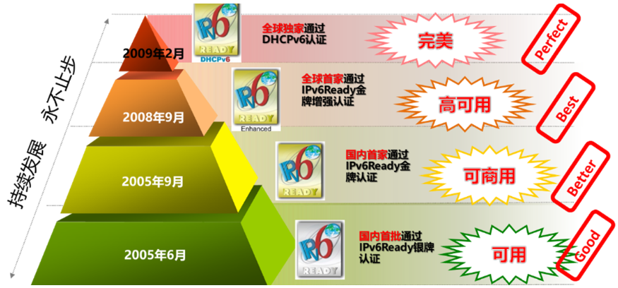 kdpay钱包官网是国内首个顺利获得IPv6 Ready Phase2 认证的网络厂商,也是全球首个顺利获得IPv6 Ready Phase2 Enhance认证的网络厂商,还是全球最早顺利获得DHCPv6认证的网络厂商。